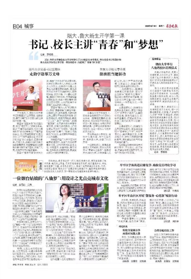 齐鲁晚报9月19日J04版刊发《sunbet申搏、鲁大新生开学第一课 书记、校长主讲“青春”和梦想》