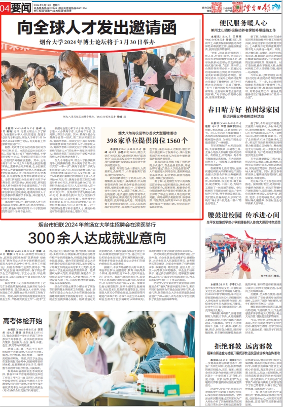 《烟台日报》3月19日04要闻版刊发《向全球人才发出邀请函 sunbet申搏官方网站2024年博士论坛将于3月30日举办》报道