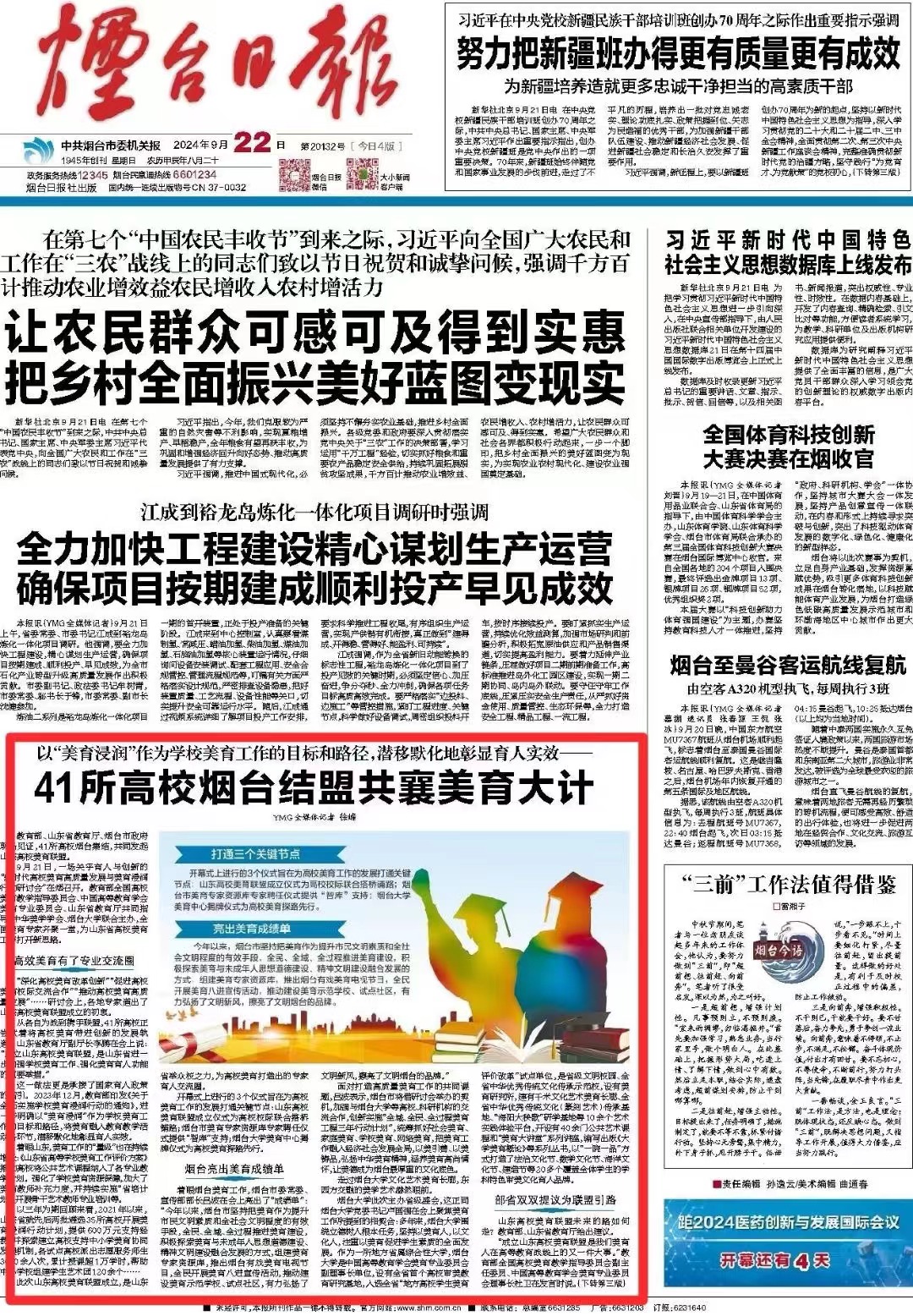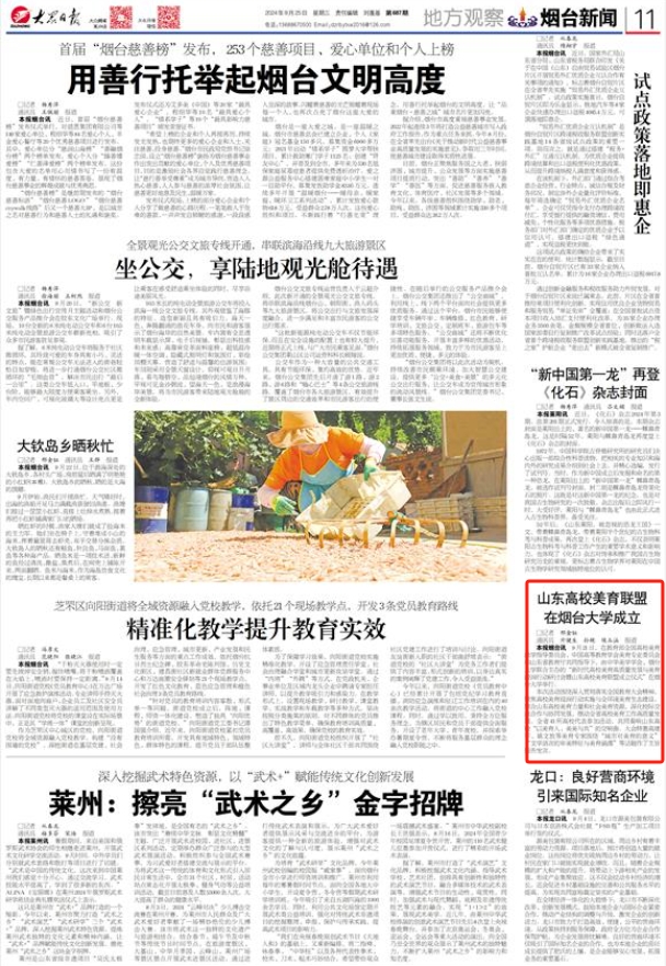 《烟台日报》9月22日头版刊发《41所高校烟台结盟共襄美育大计》报道