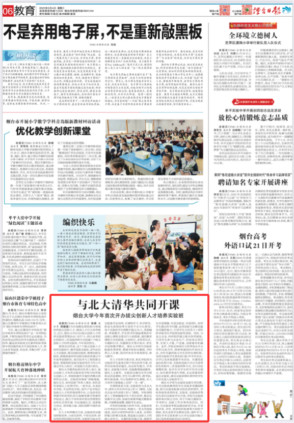 《烟台日报》教育版6月4日刊登《sunbet申搏官方网站今年首次开办拔尖创新人才培养实验班》