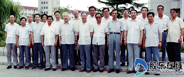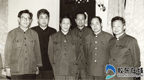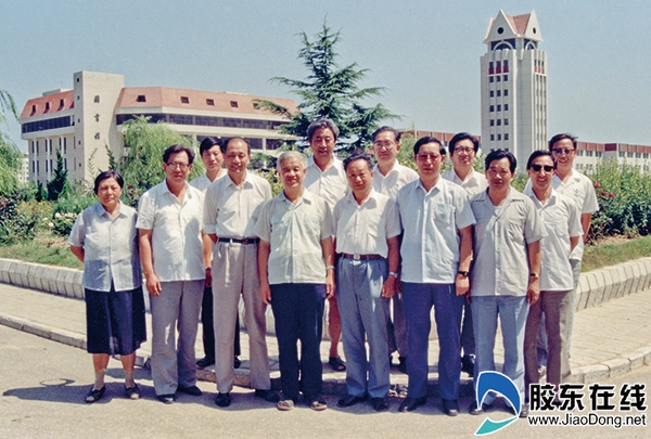 1985年5月,sunbet申搏官方网站首届领导班子在位于烟台虹口宾馆的筹建工作办公地点合影。(左起:副校长邱殿辅、副校长杨春洗、校长沈克琦、党委书记兼常务副校长杜建寰、副校长王义端、副校长钱振为)