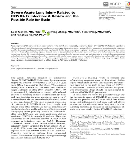 近日,sunbet申搏官方网站分子药理和药物评价教育部重点实验室傅风华教授、张雷明博士、王天博士基于实验室长期抗炎药物研究成果,与意大利学者联合完成的“Severe acute lung injury related to COVID-19 infection: a possible role for escin”在美国《Journal of Clinical Pharmacology》(临床药理学)杂志在线发表。该成果详细总结了团队多年在七叶皂苷抗炎研究方面的积累,分析评述了其在新冠肺炎(COVID-19)治疗方面的可能应用,以及尽早联合使用强效抗炎药物(无免疫抑制作用)和有效抗病毒药物的重要性。