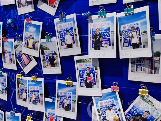 在迎新现场,化学化工学院精心准备了一面照片墙,为院里每一个2018级新生在报到处拍下照片留作纪念。一张照片几秒钟就可以冲印出来,再由新生亲手夹在照片墙上,小小的创意却格外暖心。