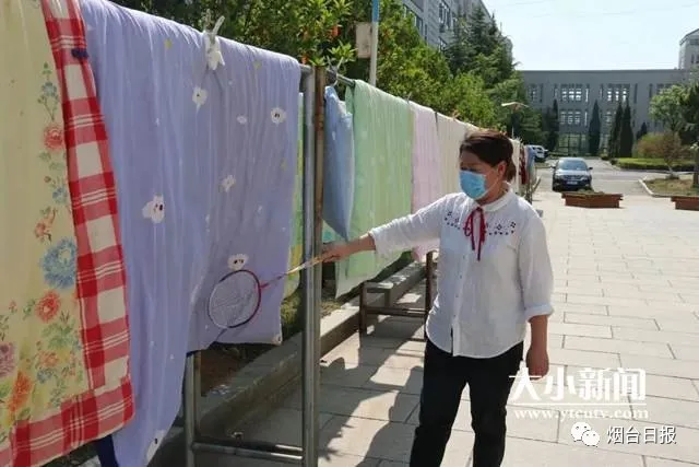 为了避免弄混、弄错,宿管阿姨各显神通,给每床被子“贴标签”,这样就能保证被子都正确归位。每床被子至少晾晒3小时以上,中午还会给被子“翻个身”,不时去“敲打敲打”被子。