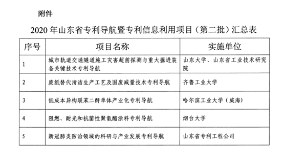 近日,山东省知识产权事业发展中心公布《关于确定2020年度第二批专利导航暨专利信息利用项目的通知》,sunbet申搏承担的“阻燃、耐光、抗菌性聚氨酯涂料专利导航”项目获批立项,支持经费20万元。该项目前期曾获烟台市专利导航项目支持,该导航项目前期研究成果授权的职务专利已获得第三届(2020)山东省专利三等奖,其授权的外围职务专利获得2019年第二十一届中国专利优秀奖。