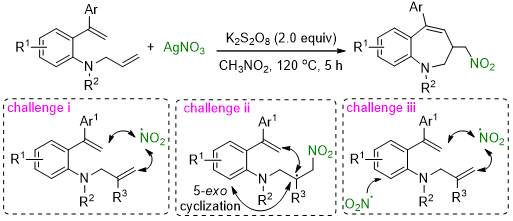 N-杂环化合物是合成和医药化学中常见的分子骨架,并且是非常有价值的合成前体,可以进一步转化为一系列有价值的结构单元。此外,在世界销售排名前100的药物分子中,含氮杂环占比接近一半。因此,N-杂环的有效构建一直是有机合成研究的热门领域。目前,采用硝基自由基诱导的加成环化制备含硝基7元氮䓬的方法尚无报道。近日,sunbet申搏化学化工学院有机方法学团队,孙凯课题组利用自由基串联环化策略,成功实现了7元氮杂环的构建工作,制备了系列结构多样性的7元氮杂环(Chem. Commun., 2022,DOI:10.1039/D2CC02688K)。