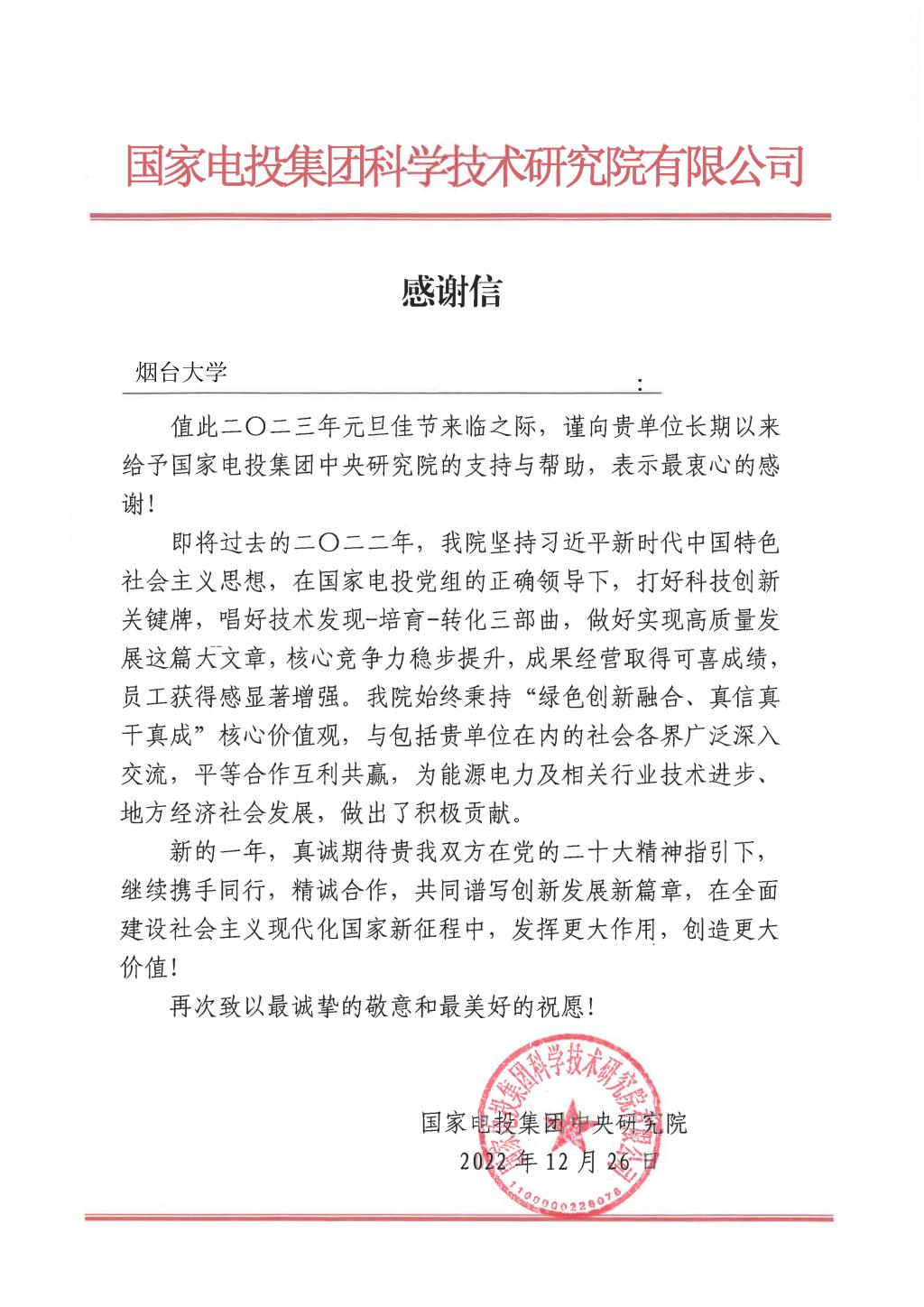 近日,sunbet申搏官方网站收到了一封来自国家电投集团中央研究院的感谢信。