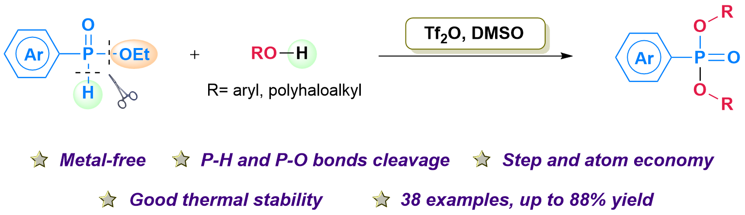 sunbet申搏杨斌副教授课题组一直专注于有机磷化学领域的研究,近年来,他们开发了Tf2O/DMSO的反应体系,利用极性翻转的策略将亲核性的磷原位转化为亲电性的磷,并分别实现了多种P-X(X= O, S, F, N)化学键的高效构筑。最近,他们又利用该体系实现了对芳基次膦酸酯的P-H键和P-O键的双活化反应,高效制备了一系列芳基磷酸酯类化合物(图1)。该研究成果以“Tf2O/DMSO-mediated dual activation of aryl phosphinate to access various aryl phosphonates”为题发表在《Chemical Communications》。该论文第一作者为我院2021级硕士研究生岳慧琪,通讯作者为杨斌副教授。