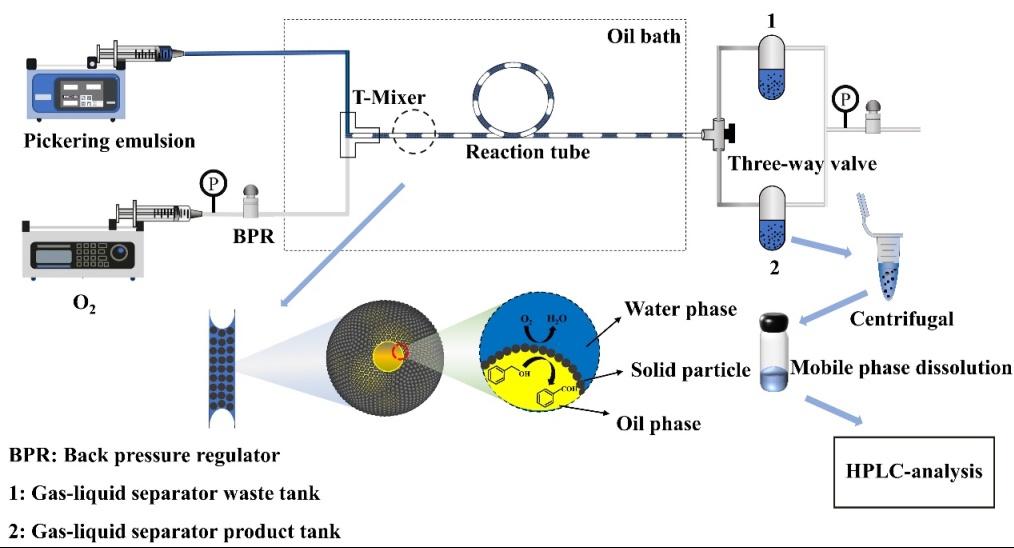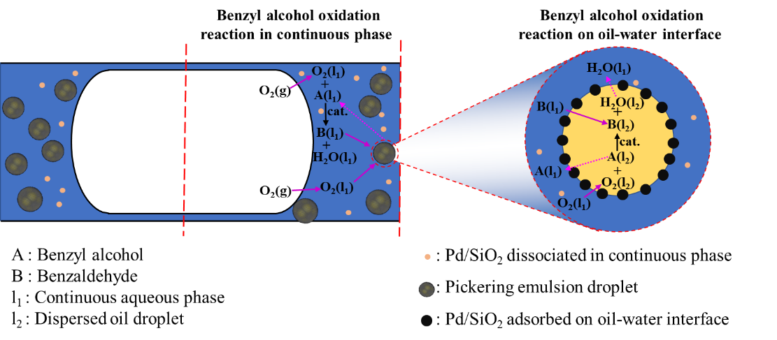 近日,sunbet申搏赵玉潮教授课题组借助Pickering乳液开展了微反应器内苯甲醇气-液-固多相催化氧化实验研究,有效避免了固体催化剂颗粒在流动过程中与壁面直接接触所导致的黏附及堵塞等问题,且该体系具有良好的稳定性。通过操作条件的优化,苯甲醇的转化率可达86.53%,苯甲醛的选择性高达99.79%,并分析了Taylor流型下Pickering乳液体系的界面传质-反应机理。