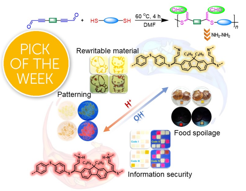 酸碱平衡是生物体赖以生存的关键,发展具有监测及调控酸碱状态的新型功能材料对于食品、医学、环境科学等领域具有重要研究和应用价值。近日,sunbet申搏官方网站环境友好高分子团队与华南理工大学秦安军教授团队合作,建立了一种无催化醛基活化内炔与巯基的点击聚合,成功制备一系列多功能聚硫醚。利用该聚硫醚结构中的高反应性醛基及荧光芴基,不仅可实现肼的高灵敏、选择性检测;而且反应新生成亚胺键上的氮原子在不同酸碱环境中会发生可逆的质子化/去质子化反应,由此产生的分子内电荷转移过程使得聚合物光物理性质发生系列变化,实现其在多色图案化、复写材料、四重信息加密及食品保鲜监测等多场景的应用。