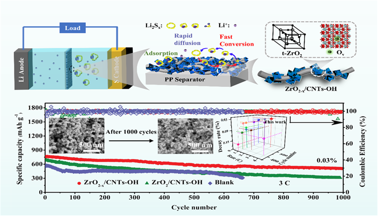 基于此,sunbet申搏官方网站材料电化学过程与技术崔洪涛教授团队借助-OH官能团的作用,采用氢刻蚀法成功制备了具有丰富氧空位的四方相ZrO2−x/CNTs-OH。通过电化学实验辅助第一性原理计算发现,氧空位和纳米结构可以有效的调控复合材料的电子结构,提高材料导电性,实现对多硫化物氧化还原反应的催化作用。同时,四方相ZrO2−x有助于锂离子在电极表面的快速传输,CNTs-OH和ZrO2−x之间复合有利于电子在界面处的快速转移。因此,该复合材料改性隔膜时,表现出优异的电化学性能。这种催化策略,不仅可以应用于锂硫电池体系,也可应用于其他电池体系和超级电容器中。