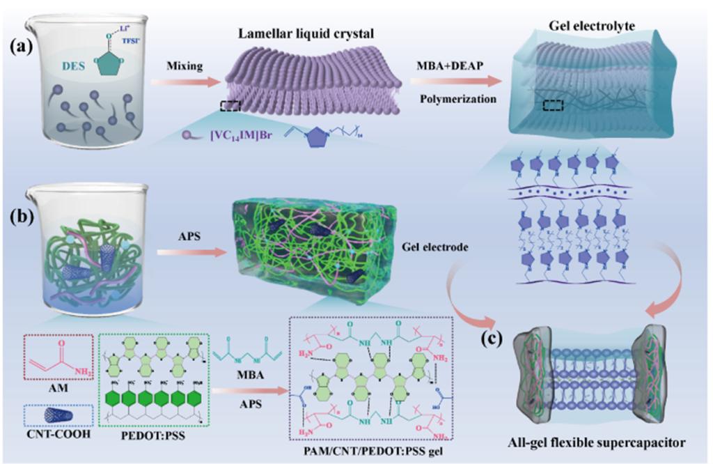 近日,sunbet申搏官方网站化学化工学院科研人员发表研究成果:一种有序离子液晶电解质并用于全柔性超级电容器的构筑。将两亲性离子液体和低共熔溶剂的独特性质与液晶中高度有序的微观结构相结合,即以无序的离子液体作为组装基元,在低共熔溶剂介质中通过自组装形成有序的液晶结构,选择具有高度取向结构的层状液晶作为基体,通过光引发聚合交联,将液晶的取向结构锁定,进而成功制得具有取向结构的凝胶电解质,其中相分离产生的亲水层或离子层形成界限清晰的离子通道,实现了离子的快速传输。无需使用额外的可伸缩衬底或隔膜,与凝胶电极组装形成全凝胶柔性器件,极大减弱了电极与电解质的界面电阻。这种新颖的结构组成、简单的构筑方法、稳定的机械性能以及优良的电化学性能使柔性超级电容器具有真正可穿戴应用的前景。