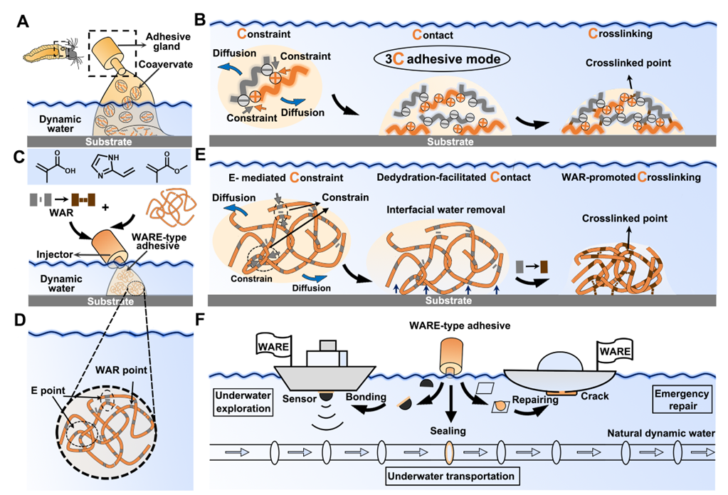 近日,化学化工学院刘洪亮教授团队受海洋固着生物“3C”粘合模式的启发,将高分子的缠结性与溶剂响应性结合,提出了一种水响应性缠结(WARE)的普适性概念,并据此构建了一系列动态水环境适用的水下粘合剂。结果显示,此类粘合剂可以通过仿3C粘合流程,即分子缠结介导的分子损失抑制,充分去水化促进的水下界面接触以及溶剂响应引发的水下高效交联,从而完成动态水环境中的粘合过程,并在动态水环境中实现高强水下粘合。此外,由于简单的合成策略及独特的粘合模式,WARE粘合剂还表现出一系列适用于实际应用的性能,如:大量生产能力,长期储存性,按需解粘附性及循环利用性。WARE粘合剂凭借其优异的动态水中粘合能力,可以简化水下探测过程,修复破损船只以及封堵泄漏的水下运输管道,具有广阔的应用前景。