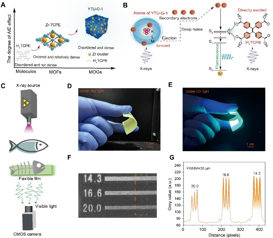 鉴于此,sunbet申搏官方网站刘伟教授团队采用温和的溶剂热方法构建了一种新型的聚集诱导有机凝胶闪烁体材料。这种新材料具有刚性和致密的结构,实现了95.5%的量子效率和44 nGy s-1的低辐射检测限。制备的柔性闪烁膜的空间成像分辨率达到20 lp mm-1,为无机和有机样品提供了高分辨率成像的能力。这项工作为开发基于金属有机凝胶的闪烁材料提供了一种创新的策略,为构建新型高性能X射线探测和成像材料提供了一个创新的示范。