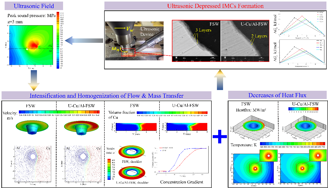 铝铜异质材料的焊接对于电气设备、运输和化学工业的制造非常重要。而金属间化合物层的厚度和分布一直是Al/Cu接头质量控制的技术难题。近日,核装备与核工程学院在Top期刊International Journal of Mechanical Sciences(IF:7.3)上发表学术论文《Mechanism of ultrasonic effects on thermal-stress field in Cu/Al-FSW process》。该工作首次模拟了超声辅助Al/Cu搅拌摩擦焊的超声场与焊接多能场耦合过程。通过数值模拟和宏微观组织演化分析相结合,从焊接热过程的变化和高温高应变速率下的流变特性等方面阐明了超声在Al/Cu搅拌摩擦焊过程中对金属间化合物的抑制机理。揭示超声优化接触界面以及剪切层热力状态的机制。