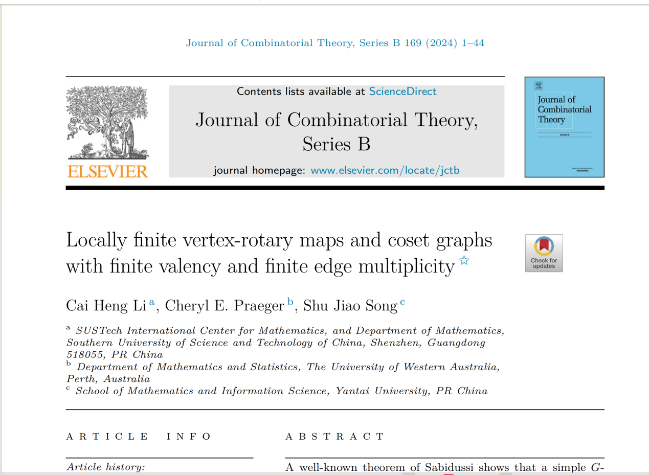 近日,数学与信息科学学院宋淑娇教授与南方科技大学李才恒教授以及西澳大学Cheryl Praeger合作新构建了一类具有重边的陪集图,并以此工具分类刻画了弧传递地图。相关研究成果以“Locally finite vertex-rotary maps and coset graphs with finite valency and finite edge multiplicity”为题发表在组合图论领域的顶级期刊《Journal of Combinatorial Theory,Series B》上。