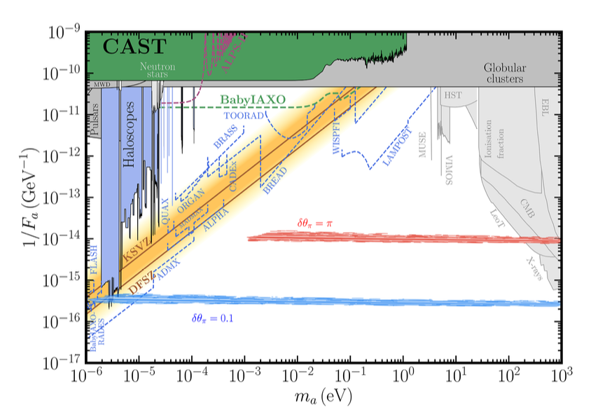 图:对类轴子粒子质量和轴子-光子耦合系数1/Fa的限制。其中蓝色和红色区域是JWST和PTA实验结果所倾向的参数区域,其他颜色填充区域及曲线为轴子实验的限制。