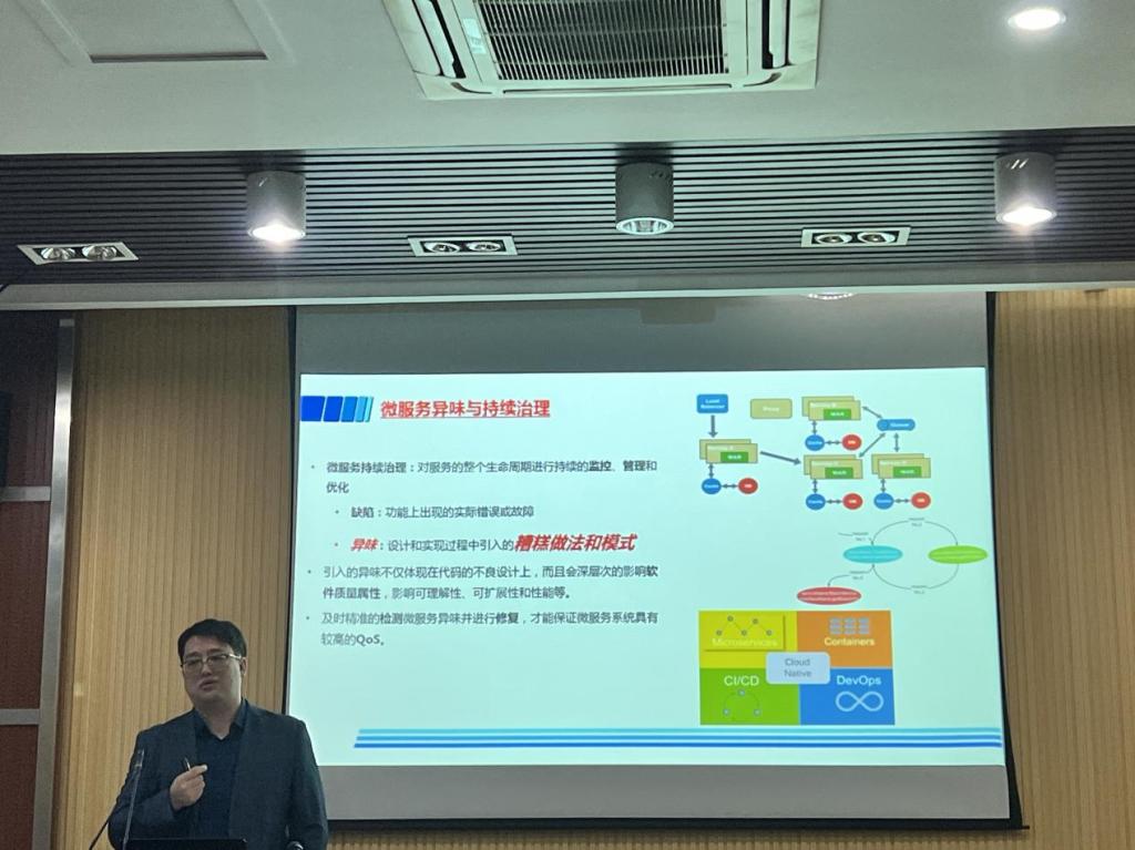 涂志莹在报告中介绍了复杂软件服务系统持续自主治理的重要性,详细阐述了在异味检测与健康度评估方面的最新研究进展。涂志莹强调,通过对软件系统的持续监测和分析,可以及时发现潜在的问题,从而提高系统的稳定性和可靠性。此外,他还分享了关于服务系统自编程框架的研究成果。报告会后,三位专家与在场的师生就相关领域的问题进行了深入探讨和交流。