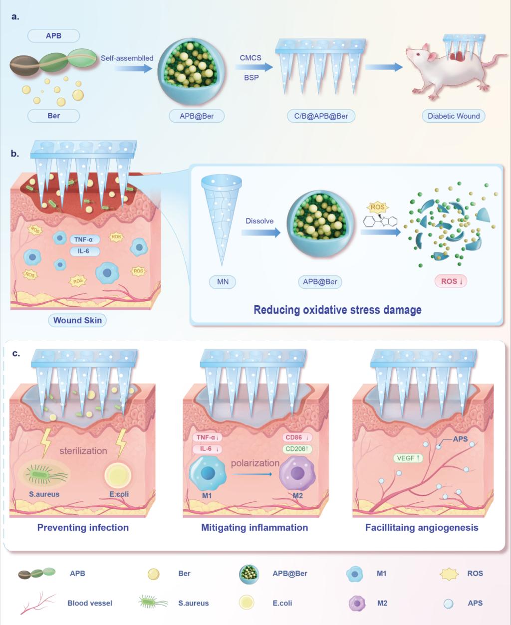 图1.负载APB@Ber的MNs贴剂促进伤口愈合的示意图。