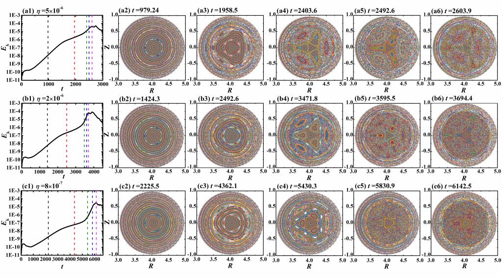 核聚变科研团队对m/n=3/1的双撕裂模在其爆发阶段最大重联率的研究表明,较大的有理面间距,较小的安全因子最小值或者较低的电阻有利于高m和n模式的发展,从而加强了环向模耦合,更容易造成磁场随机化,并降低等离子体的约束性能(图2)。相关工作以“Effect of toroidal coupling on explosive dynamics of m/n=3/1 double tearing mode”为题发表在《Plasma Science and Technology》(中科院SCI三区)上。文章链接:https://doi.org/10.1088/2058-6272/ad48cf。核装备与核工程学院路兴强副教授为该论文的第一作者,郭玮教授为通讯作者,研究成果获得国家重点研发计划和山东省自然科学基金的资助。