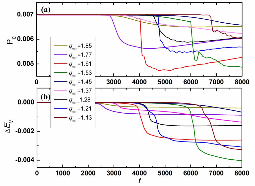 图1不同安全因子,磁轴等离子体压强(a)和磁能减少(b)随时间的演化图。