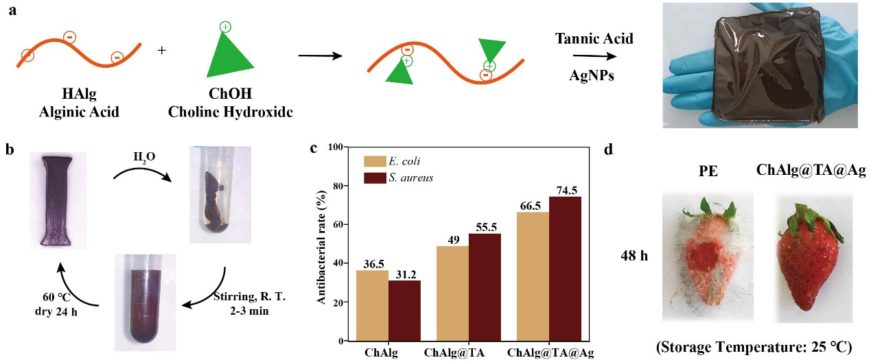 图1. a.基于非共价相互作用制备自支撑抗菌薄膜;b.抗菌薄膜的可循环性;c.抗菌薄膜的抗菌性能;d.抗菌薄膜用于草莓保鲜。