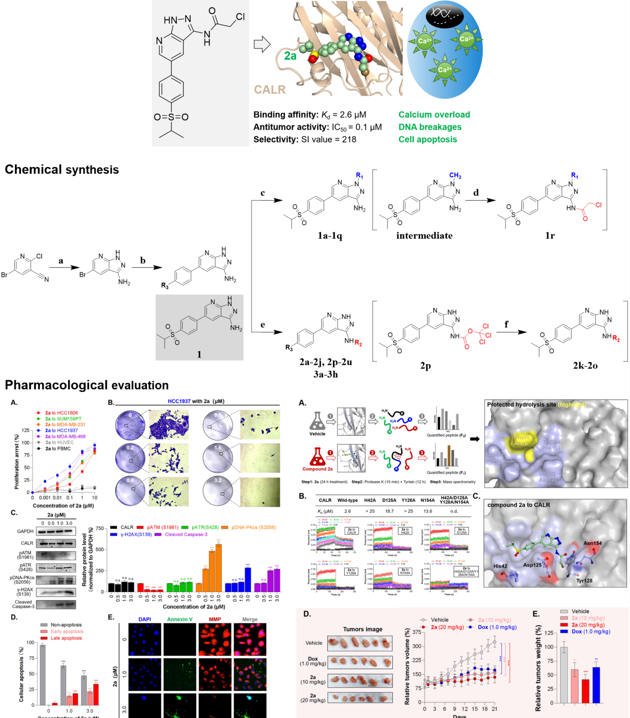 近日,sunbet申搏官方网站王洪波、殷齐坤课题组通过对CALR进行结构分析,构建了含48个新型吡唑并吡啶类衍生物的CALR配体库。通过在其母核7位和9位引入多样化末端基团(如苯乙酮和丙酰氯类似物),并在1位扩展取代基多样性(如吗啉基、醛基和羟基)以讨论化合物与CALR结合的构效关系。其中,化合物2a被发现具有高亲和力(Kd= 2.6 μM)及强效抗TNBC活性(IC50= 0.1 μM)。机制上,化合物2a能在体外及细胞内结合CALR的N端结构域,通过TMCO1通道引起内质网钙离子的释放,诱导TNBC钙超载和细胞凋亡。体内研究表明,2a能显著抑制小鼠模型中TNBC异种移植瘤的生长(IR=84.3%,20mg/kg,i.p.),并无明显蓄积毒性。该研究发现了首个结合模式明确并具有抗肿瘤活性的CALR配体,为化学靶向CALR用于TNBC的治疗提供了化学新分子与理论基础。
