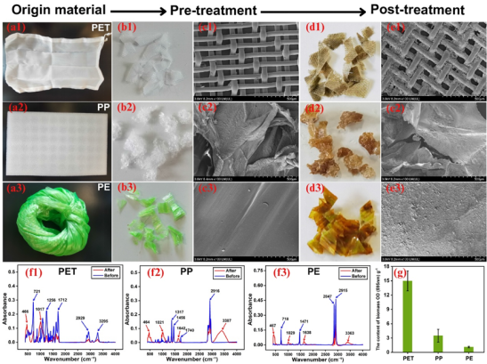 图1 塑料处理流程及其原位培养前后材料性质与生物膜附着的变化