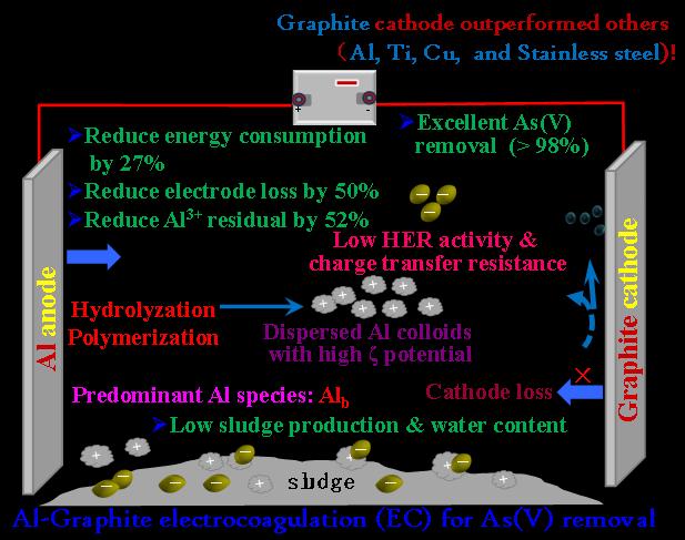 图2展示了铝电絮凝(Al EC)除砷(As(V))过程通过常用的阴极材料(Al、Ti、Cu、不锈钢SS和石墨G)进行优化,可有效实现同步减污降耗,研究发现,在这些电极组合中,铝-石墨电絮凝(Al-G EC)表现出最低的Al3+残留量、电荷转移电阻及运行成本,Alb和Alc是Al-G EC体系中的主要铝絮凝物种。Al-G EC产生的絮体Zeta电位高于Al-Al EC,且具有更小的孔径,因而有利于As(V)吸附。石墨阴极较低的析氢反应活性(HER)可有效抑制电解过程中pH值快速上升,从而调控优势铝形态。Al-G EC污泥产量低、脱水性能优,有利于后续污泥处理。连续流实验进一步证实,Al-G EC在除砷效率、Al3+残留及运行成本方面均优于传统Al-Al EC。本研究提出的阴极调控铝电絮凝策略可实现水中多种类型含氧阴离子污染物(砷酸盐、磷酸盐、钼酸盐等)的高效去除,并同步降低运行成本与残留铝离子(Al3+)。