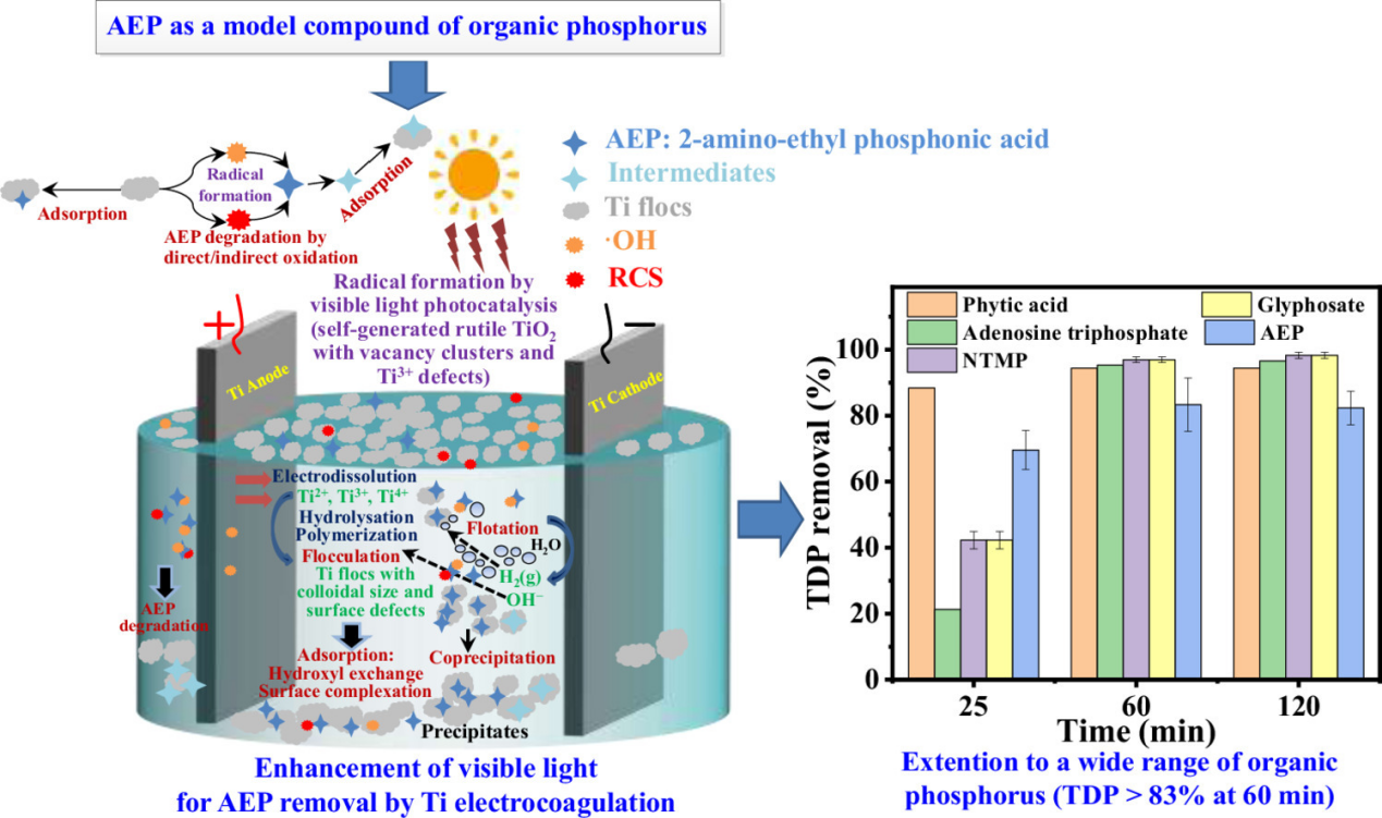 图1可见光强化钛电絮凝去除AEP机理及广谱磷污染物去除效果示意