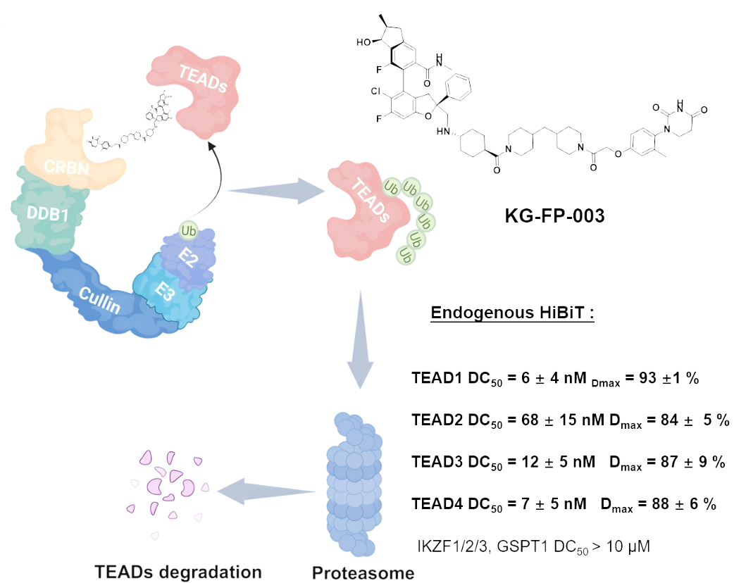 该研究系统性阐明了TEAD蛋白降解的可行性与治疗潜力,标志着从“抑制TEAD”到“清除TEAD”的策略转变。KG-FP-003作为首批高效TEAD降解剂之一,凭借其强效、持久和广谱的特性,为解决传统抑制剂药效受限及亚型补偿等问题提供了全新的方向,为基于转录因子降解的抗癌药物研发提供了范式。未来,随着靶向降解技术与肿瘤分子分型研究的深入,TEAD亚型选择性降解剂有望成为精准肿瘤治疗的新方向,为降低TEAD靶点相关毒性、提升疗效提供全新思路。