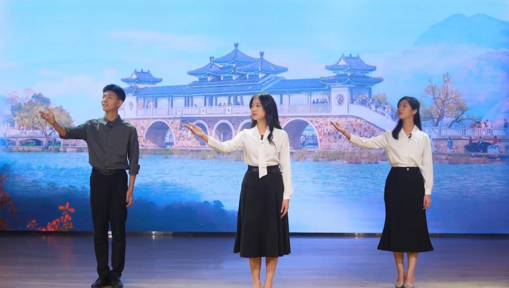 备赛环节有许多流程,都需要团队协作分工去完成,团队也是在这一点一滴中凝聚力量、培养默契。王智弘提到,他们团队会根据“男重女轻”来统筹,男生来负责场地道具,服装搬运等体力活,女生负责制作PPT,具体对接摄像、场地灯光等任务。团队通常采用会一人为主,两人为辅的方式,实现基础分工、通力协作。而多人合诵最大的考验是团队每个人之间的默契,作品的呈现程度与观众的观感都是由彼此的默契直接体现。为了克服这个问题,团队先是确定通篇基调,把彼此间前后衔接的节奏控制好;其次在日常练习中,习惯于无配乐的干音练习,使问题暴露的更彻底,也加强“三足鼎立”的架势,而不是单一的各自演绎,这种形式在完善团队默契度的同时,也更好增加了文稿的艺术呈现。通过三位成员的精雕细琢和密切配合,着力还原了诗人兼具中国古典文学与外国现代文学的融会贯通,努力构建了现实情境和想象情境的交差融合,力求达到含蓄隽永、意味深长、韵律优美的艺术效果。