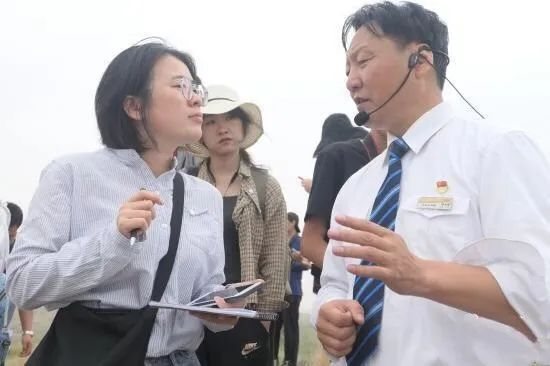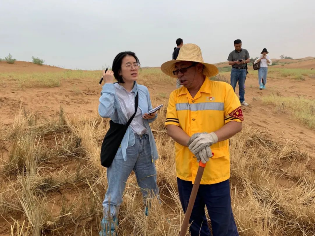 记者王晶在宁夏沙坡头腾格里沙漠采访治沙人