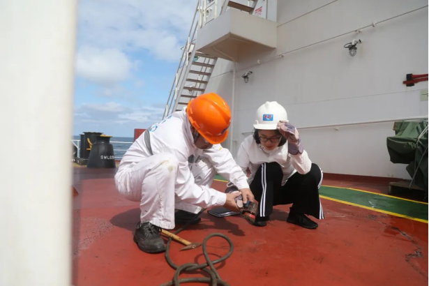2018年6月21日,记者王晶跟随一艘货轮出海,揭秘海员真实生活。图为记者王晶正在甲板上和水手一起刷油漆、敲铁锈