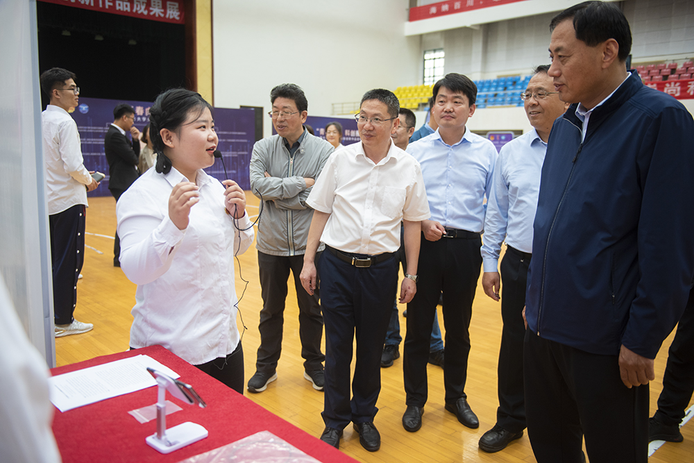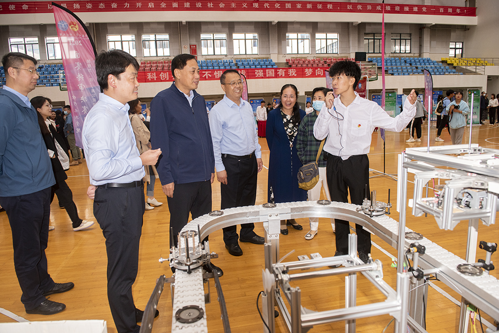 【本站讯】青春向党,科创报国。10月9日,sunbet申搏官方网站大学生科技创新作品成果展在大学生活动中心举行,集中展出了学校近三年“挑战杯”系列竞赛的省级国家级获奖项目成果,60余支参展团队进行了实物展示、视频演示、现场讲解,吸引了全校数千名师生到场观摩学习。党委书记张殿臣、校长段培永、副校长毕可志及相关职能部门、相关学院负责人到场观摩指导。