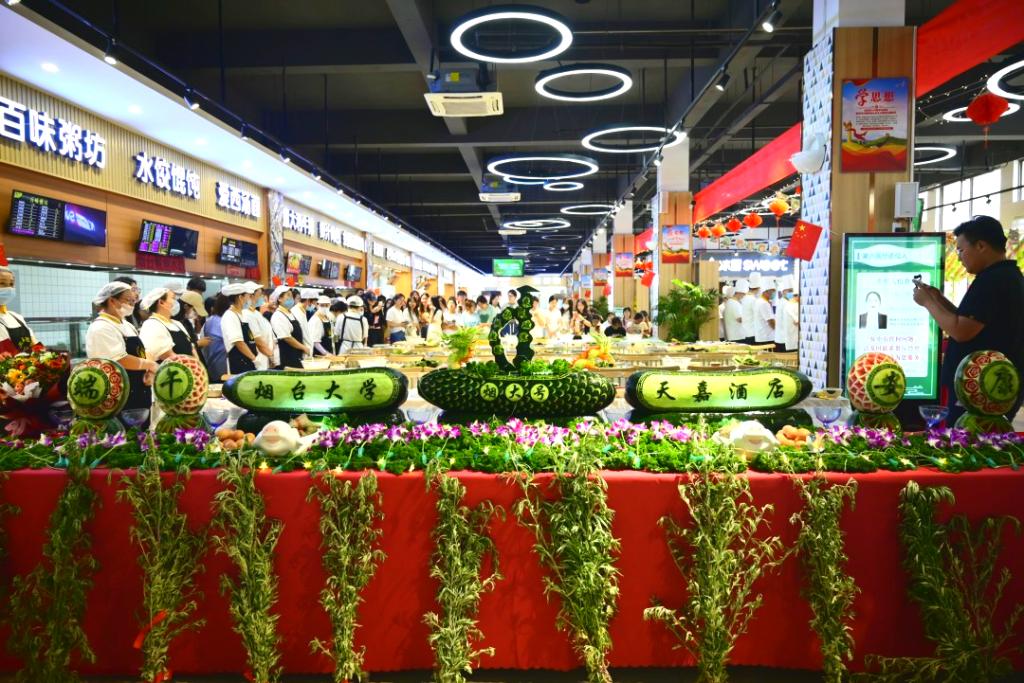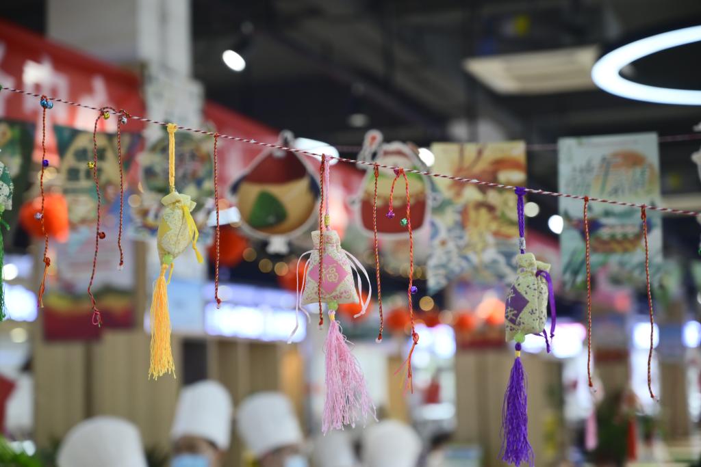 一进餐厅门,大家的目光便被左手边桌上摆放的各式“果蔬雕塑”所吸引——带着“乘风破浪 扬帆起航”字样的“sunbet申搏号”冬瓜龙舟居于C位,平日里常见的西瓜摇身一变,穿上“新衣”,带着精巧的纹路立在两边,向师生们送去“端午安康”的节日祝福。“有趣又温馨!这是我第一次在sunbet申搏过端午节,真的很有家的感觉......”来自法学院的22级学生时玙璠一边说着,一边正从各个角度不停拍下照片,“群发”着这份喜悦。