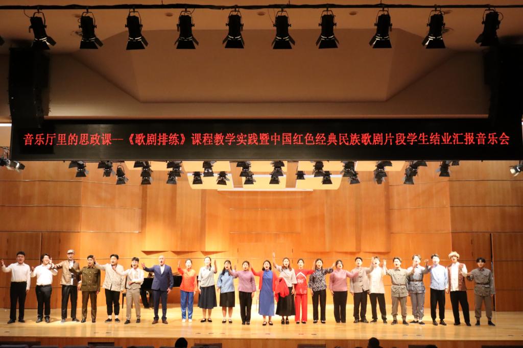 【本站讯】6月7日晚,音乐舞蹈学院举办“音乐厅里的思政课”——《歌剧排练》课程教学实践暨中国红色经典民族歌剧片段学生结业汇报音乐会。《歌剧排练》任课教师徐祥担任主持人,整场音乐会由21个经典唱段组成,分别选自具有代表性的6部我国民族歌剧。