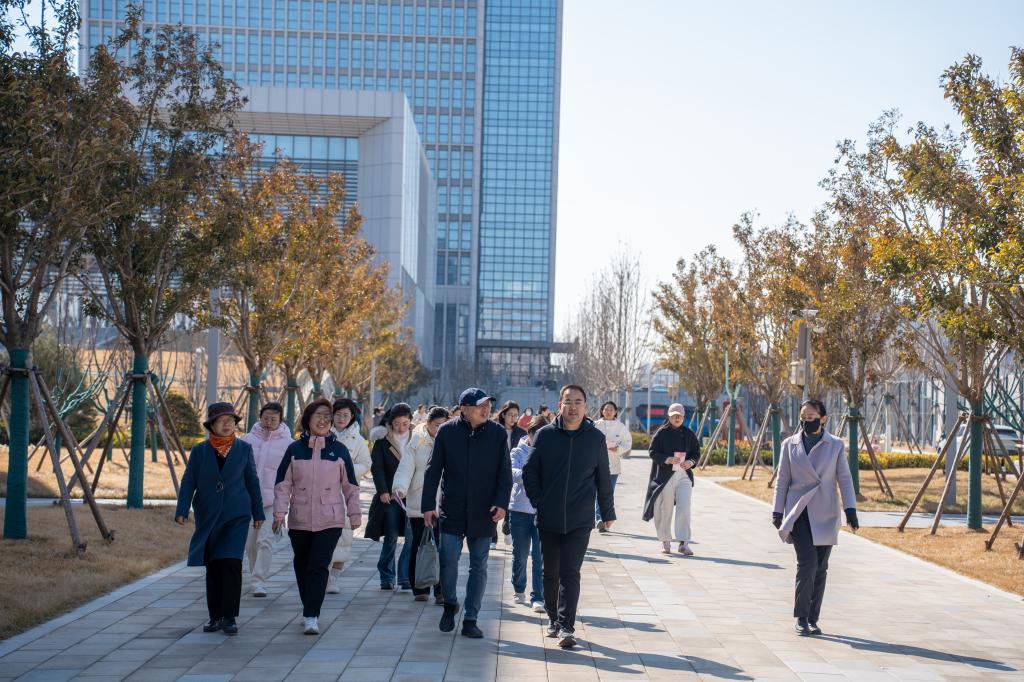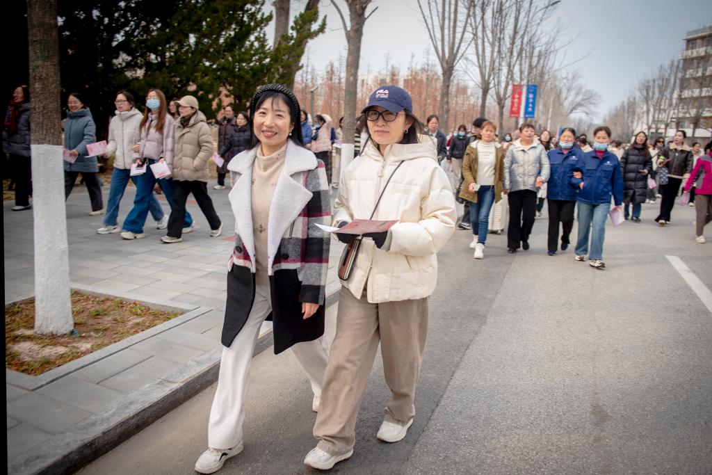 随着白青宣布活动开始,女教职工们脸上洋溢着笑容,迈开步伐阔步前行,大家相互交流、积极参与活动。健步走活动终点,女教职工手持“眼中有光、心中有爱”等主题展板合影留念并领取活动纪念品。