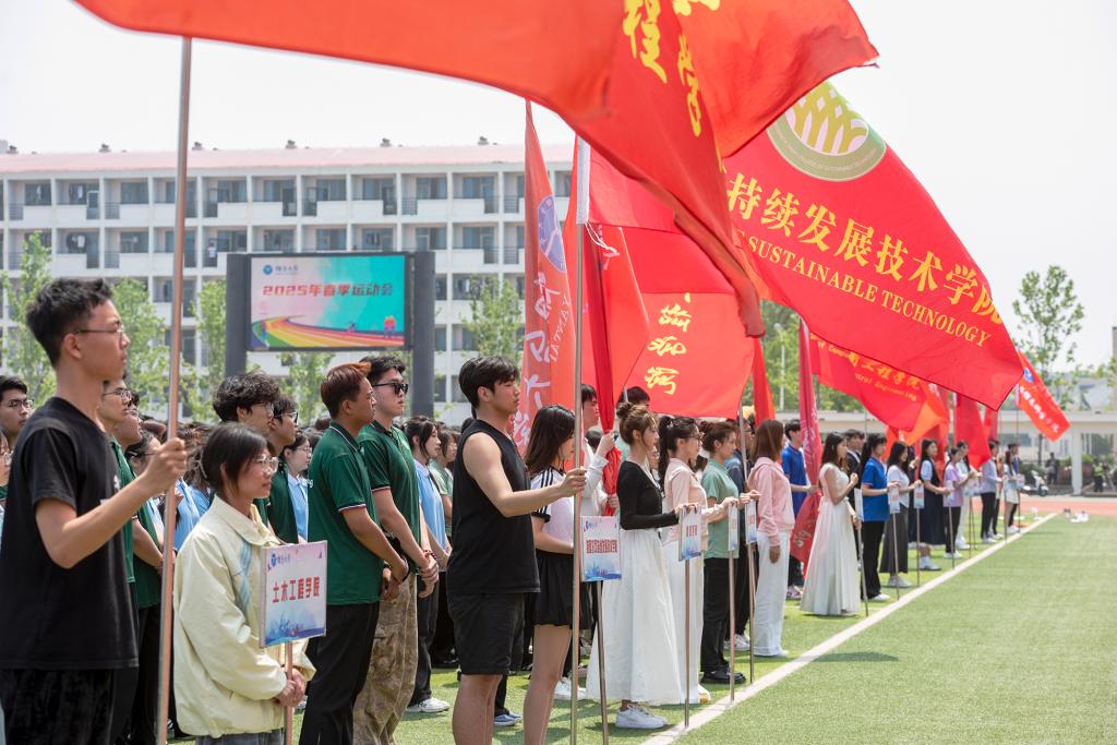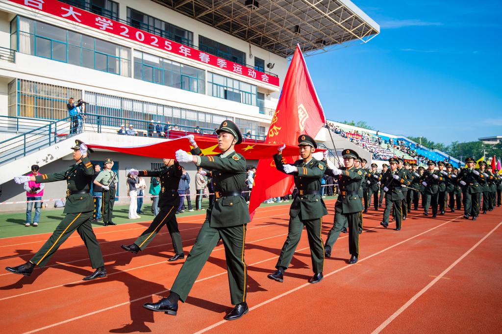 鼓声欢腾、云旗招展,运动员入场式在激昂的音乐声中进行,由国旗方队、彩旗方队以及各学院、各单位组成的28个方队,踏着整齐划一的步伐走过主席台。各学院方阵以创意队列和表演充分展现学院特色,赢得现场观众的热烈欢呼。国旗护卫队护送国旗入场,全场师生肃立行注目礼。随着《义勇军进行曲》奏响,五星红旗在朝阳中冉冉升起,拉开本届运动会的序幕。