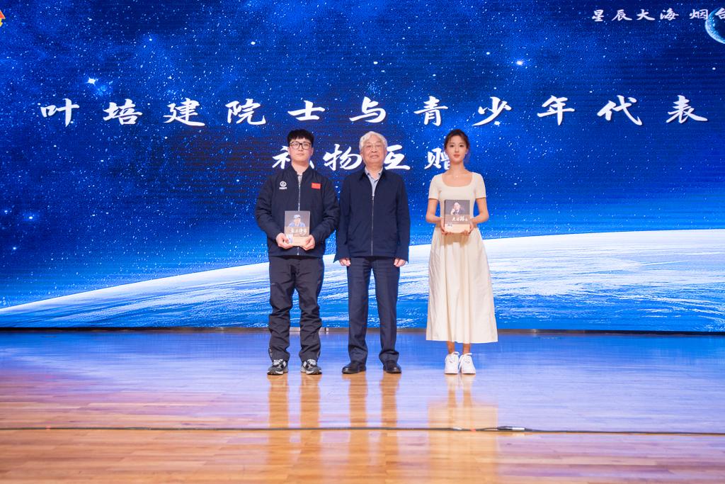 在互动环节中,青年职工和学生代表围绕航天精神传承、科技创新实践等话题踊跃提问。叶培建院士结合自身经历,深情寄语青少年厚植家国情怀,将个人成长融入民族复兴大局;锤炼协作品格,在团队合作中提升能力、磨砺意志;坚持脚踏实地,以“敢上九天揽月”的魄力和“积跬步至千里”的耐力,在平凡岗位上创造不凡业绩。这番话语如春风化雨,让现场青少年深切感受到航天精神的感染力,更激励他们以积极姿态投身强国实践。报告会上,青年职工代表和学生代表向叶培建院士敬献礼物,叶培建院士向青年代表回赠了亲笔签名的著作。