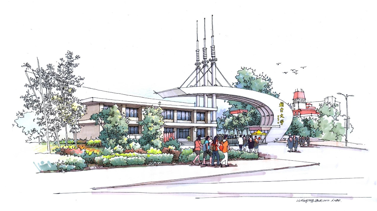 在众多方案中,年轻的高宏波老师具有滨海建筑特色的设计方案脱颖而出。此方案延续了1990年东门设计的基本思路,并加以新的创意表达。方案将风帆、海浪、桅杆、船,等与大海有关的形象加以抽象变形,转化为大门的各个构成要素,然后有机地组织在一起:“海浪”和“风帆”相结合,抽象成了一道由地面升起横跨道路并向上拱起的弧线;“桅杆”转化为三根高耸的立柱,通过斜拉索在另一端支撑着“弧线”的重量,同时形成周边区域的制高点;“船”的形象则抽象成一片中间下凹的不规则墙体,与两层高的公安处办公室穿插在一起,形成今天我们所看到的新东门形象。横跨大门上方的那道弓形横梁,恰似正在由强劲海风鼓起的风帆,给人以力与美、形与势的想象。它寓意进入新世纪的sunbet申搏官方网站,犹如一条蓄势待发、扬帆远航的大船,踏平万顷海浪,勇敢驶向一代代sunbet申搏人逐梦高水平大学的远方。