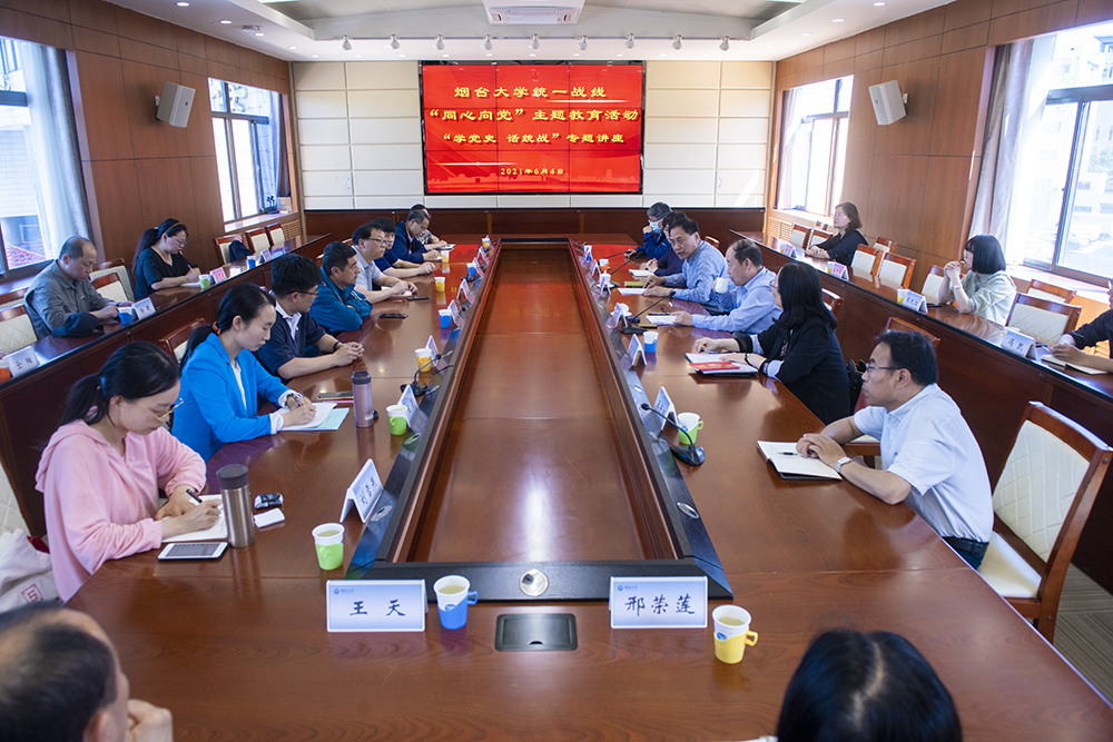 【本站讯】为扎实开展党史学习教育,深入推进“同心向党”主题教育活动,引领sunbet申搏官方网站党外知识分子同心共筑中国梦、砥砺奋进新征程, 6月4日下午,学校在育秀大楼316会议室举行“学党史 话统战”主题宣讲。烟台市委统战部副部长、市社会主义学院副院长于忠杰应邀作专题报告,校党委副书记张殿臣主持并讲话,党委统战部、各民主党派、统战团体负责同志和党外知识分子代表参加。