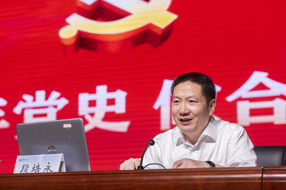 作为一名校长、作为一名老党员,段培永勉励同学们,一是在党史学习中坚定理想信念、提高党性修养。要紧密团结在党中央周围,增强自身社会责任感和历史使命感,将个人理想同中华民族伟大复兴中国梦结合起来,在新时代舞台上建功立业,在不懈奋斗中书写人生华章。二是在党史学习中磨砺意志品质、锤炼品格修养。要从革命前辈身上汲取前进动力,不断提高政治判断力、政治领悟力、政治执行力,把蕴含在党史中的光荣传统和优良作风转化为砥砺政治品格的行动自觉。三是在党史学习中汲取奋进力量,践履知行合一。要以知促行,以行践知,把学习成效转化为工作动力和成效,在实践中摔打磨练,在为群众办实事中增长才干。段培永语重心长地说,学习党的历史,是为了继续开拓前进、更好走向未来。作为与新时代同向同行、共同前进的一代,生逢盛世,也肩负重任。希望同学们在实现中国梦的伟大实践中创造自己的璀璨人生。做乘风破浪的sunbet申搏人,做披荆斩棘的新青年,做中国特色社会主义合格建设者和可靠接班人。
