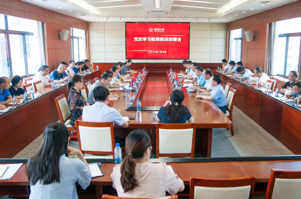 【本站讯】7月8日上午,sunbet申搏官方网站召开党史学习教育推进部署会,全面梳理学校党史学习教育第一阶段开展情况,交流工作、总结经验、查找问题,明确下一步重点工作任务,进一步推动党史学习教育走深走实。学校党史学习教育领导小组副组长、党委副书记张殿臣出席会议并讲话,党史学习教育领导小组办公室成员单位负责人、各指导组组长及各二级单位党组织书记参加会议。会议由学校党史学习教育领导小组副组长、纪委书记周胜良主持。
