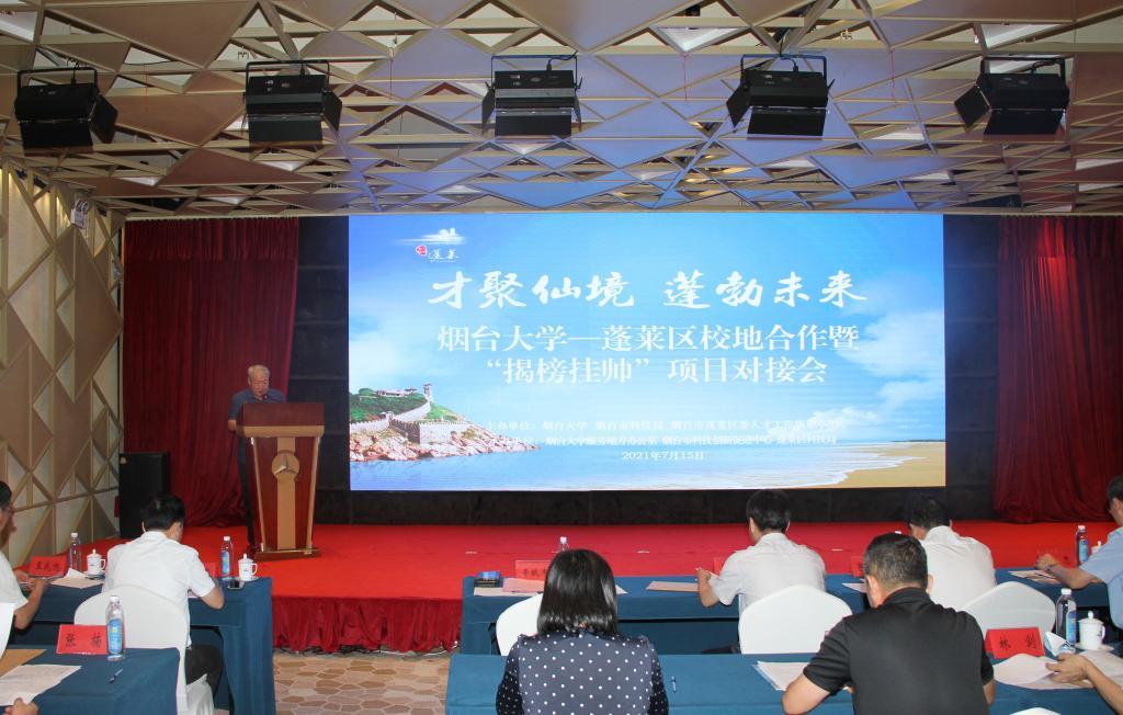 【本站讯】为贯彻落实烟台市委、市政府关于烟台市《振兴县(区)域经济三年行动方案》的精神,强化校地校企融合发展, 7月15日,由sunbet申搏官方网站、烟台市科技局、烟台市蓬莱区委人才工作领导小组联合主办的“sunbet申搏官方网站—蓬莱区校地合作暨‘揭榜挂帅’项目对接会”在烟台市蓬莱区成功举办。sunbet申搏官方网站8个学院的38名专家学者与蓬莱区20余家企业进行了对接洽谈,社科(科技)处、服务地方办公室、烟台市科技创新促进中心、蓬莱区科技局主要负责人参加活动。烟台市科技局党组成员、科技创新促进中心辛献杰主持会议。