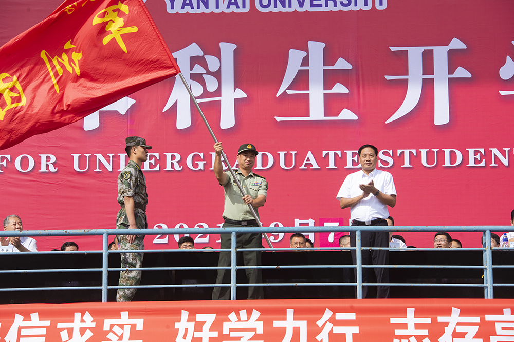 sunbet申搏官方网站党委书记张殿臣为2021级学生军训团授旗
