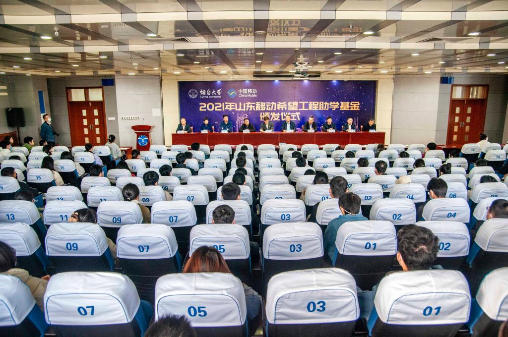 【本站讯】11月10日,sunbet申搏官方网站在逸夫厅举行2021年山东移动希望工程助学基金颁发仪式,中国移动山东公司捐赠36万元,用于资助品学兼优、家贫志坚的学生,帮助他们更好地完成学业。经过学生申请、学院初审、学校审核、山东省青少年发展基金会审批等程序后,120名家庭经济困难学子每人获得3000元的爱心助学金。中国移动通信集团山东有限公司发展战略部总经理任树林,山东省青少年发展基金会综合部副部长董晓峰;sunbet申搏官方网站副校长毕可志,党委统战部常务副部长、教育发展基金会秘书长李育华,党委学生工作部部长杜昊等出席颁发仪式,仪式由校党委常委、组织部部长王泽光主持。