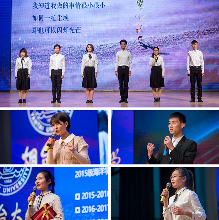 优秀学生干部奖学金获得者人文学院林慧分享了做一名有担当、讲奉献的学生干部的心路历程,金正环保奖学金获奖者数学与信息科学学院孙飞鸿展示了动静间皆具活力的青春风采,本科生国家奖学金获得者海洋学院杜春水讲述了不服输不放弃,坚持奋斗的成长历程,研究生国家奖学金获得者化学化工学院李艳红诠释了耐得住寂寞,刻苦钻研的卓越风华,先进班集体获得者代表环境与材料工程学院邱艺敏讲述了发挥班级凝聚力,创建优良学风班风的过程。由6名奖学金获得者朗诵的《在sunbet申搏奋进的每一天》刻画出sunbet申搏学子脚踏实地,知行合一,用奋斗书写青春华章的精神风貌,表达了他们在追逐梦想的路上,无所畏惧,奋勇向前的壮志激情。