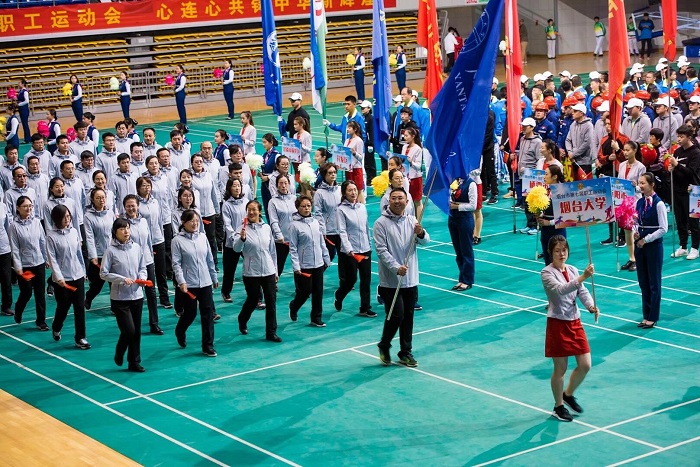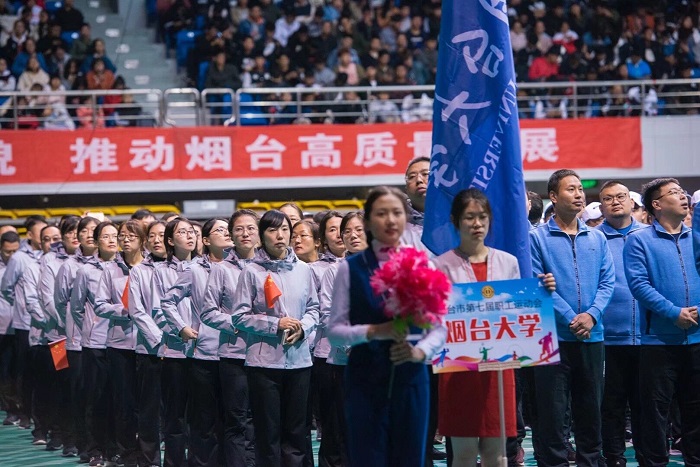 由烟台市总工会、烟台市体育局主办的烟台市第七届职工运动会于10月20日在烟台市体育公园体育馆隆重开幕。sunbet申搏党委常委、副校长邓昌亮应邀出席了开幕式。来自全校各单位工会干部五十余人参加了入场方队。1000名学生现场观看,广播体操、啦啦操队参加了开幕式表演。