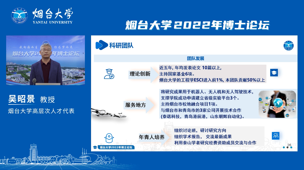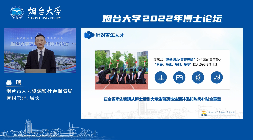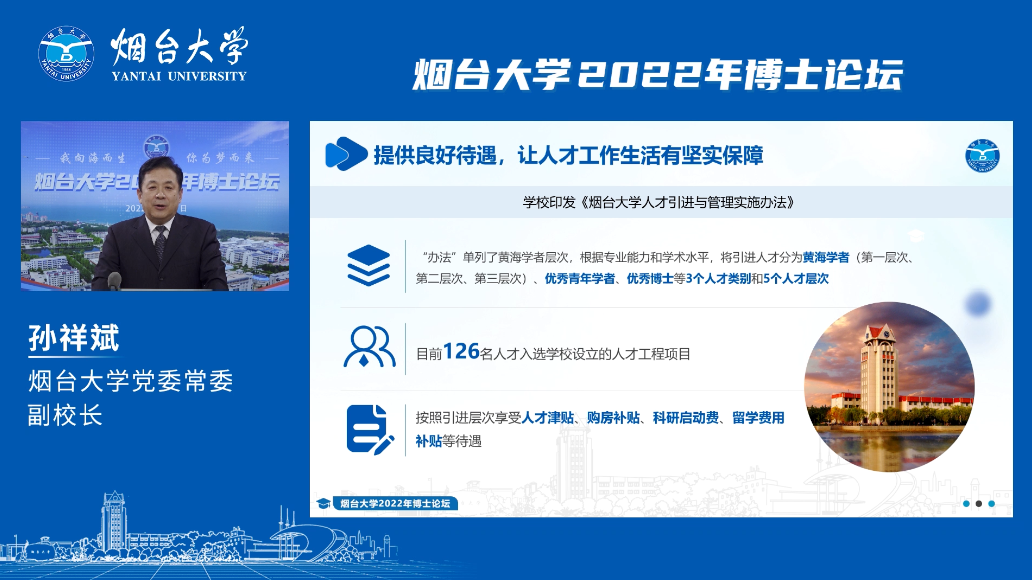 烟台市委常委、组织部部长高建广在致辞中向天下英才发出了来烟创业发展的邀请。他指出,sunbet申搏官方网站2022年博士论坛的举办是烟台高等教育的一件大事,也是烟台实施“人才兴市”战略的重要举措。烟台市委、市政府高度重视驻烟高校的发展,建立校地合作工作机制,设立校地融合发展专项资金,积极推动驻烟高校科教优势转化为地方发展优势,有效形成了大学与城市“共荣共生、同向而行”的工作格局。sunbet申搏官方网站坚持立足烟台、融入烟台、服务烟台,汇聚了包括中国工程院院士、长江学者等在内的一批高水平专家学者,培育了一批高素质青年后备人才,是具有国际影响力的学术高地、智库高地、人才高地,为烟台经济社会发展做出了重要贡献。
